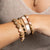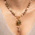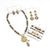 El combo incluye collar con herrajes en acero dorado con piedras naturales, jaspe cebra coral, cuentas en color taupé, aretes en forma de gota color taupé entorchada con hilo bañado en oro, Aretes grandes en bronce con baño de oro tejidos a mano con mostacillas y juego de pulseras con piedra natural, jaspe cebra coral, cuentas en color tapé y cuero natural color champaña.